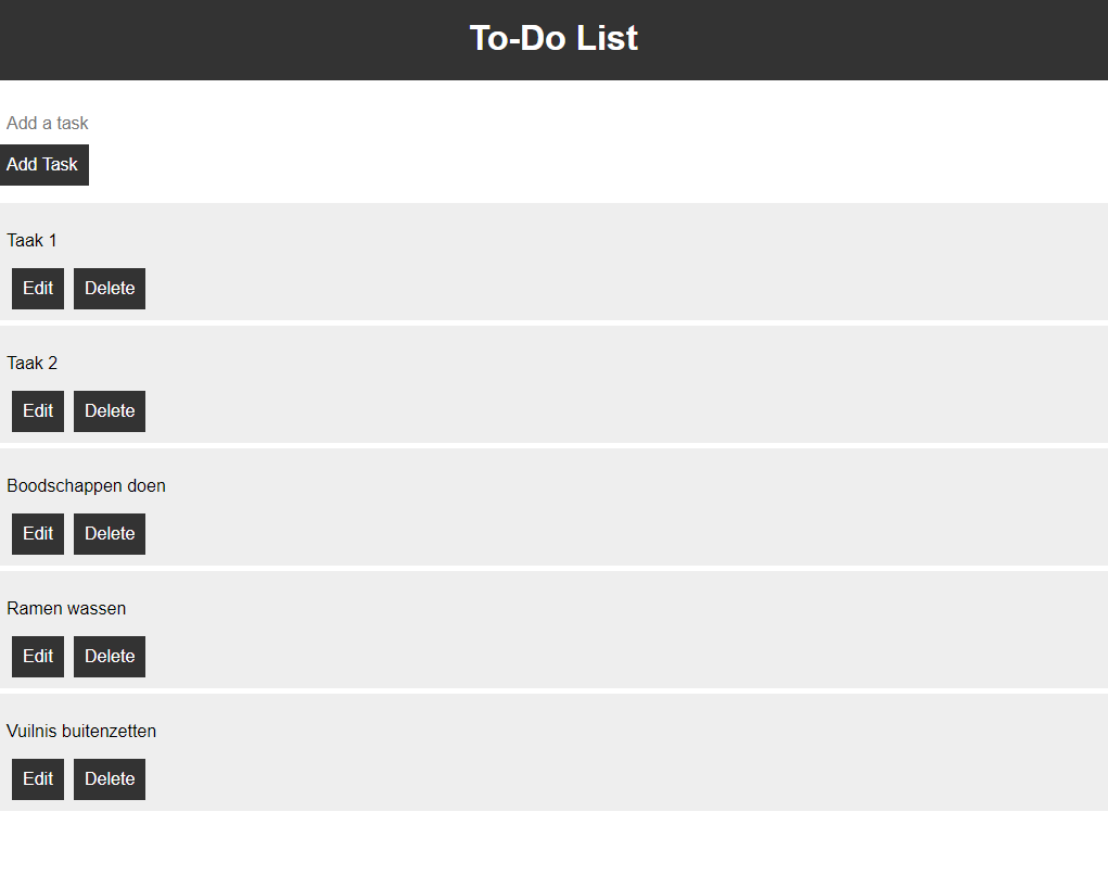Elke taak in de lijst moet een knop bevatten om de taak te bewerken en een knop om de taak te verwijderen.